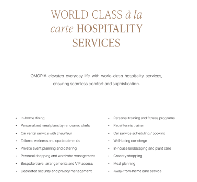 تعيد أوموريا تعريف مفهوم السكن الفاخر عبر خدمات ضيافة عالمية المستوى مصممة خصيصاً لتناسب أسلوب حياة كل مقيم. من تناول الطعام داخل المنزل والعلاجات الصحية إلى تنظيم المناسبات الخاصة والتسوق الشخصي وخدمات السفر وتأجير السيارات، تم تصميم كل جانب لتوفير الراحة والفخامة دون عناء.