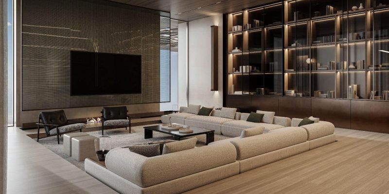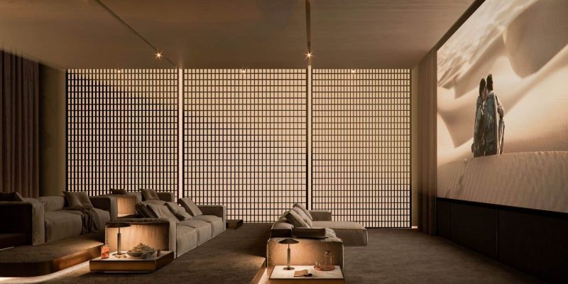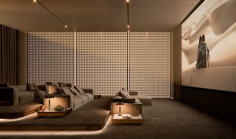 غرفة عرض فاخرة ومريحة تتيح للسكان الاستمتاع بالأفلام أو الأحداث الرياضية أو اللقاءات الخاصة في جو من الراحة والخصوصية المطلقة.