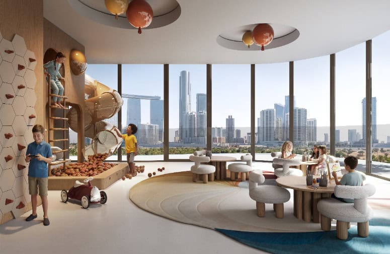 Indoor play with skyline views and soft design.
