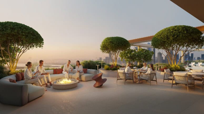 A landscaped outdoor lounge for sunset conversations and late-night calm—ideal for small gatherings, quiet reading, or simply enjoying the skyline in a more intimate setting.