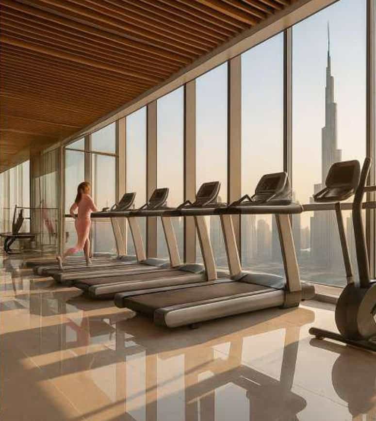 Cardio faces the view; strength and stretch zones are arranged for smooth flow—wellness designed for consistency rather than spectacle.