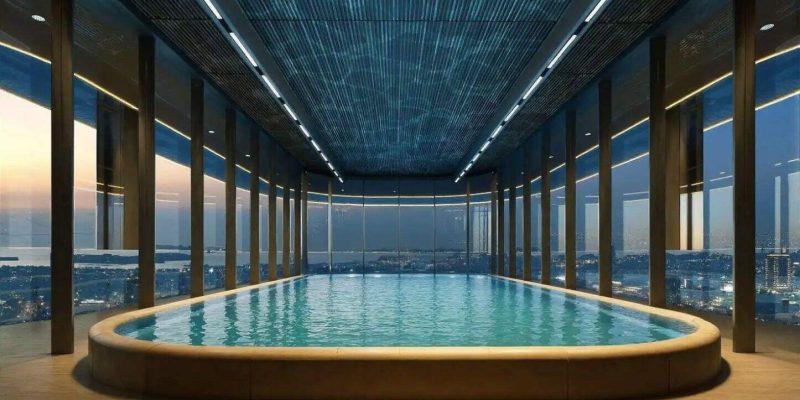 The Sky Pool suspends above the skyline as a serene escape for the workers of Lumena with high floor to ceiling glass windows, natural light and breathtaking views are at the heart of this retreat featured with plenty of poolside lounging areas.