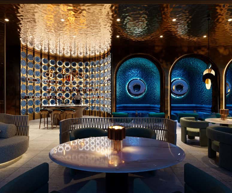 Low, velvety lighting, refined mixology, and indoor–outdoor seating set an intimate tone; arrive for sundowners, stay for conversation as the coastline glows below.