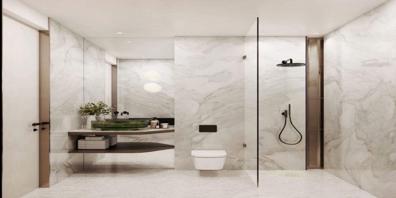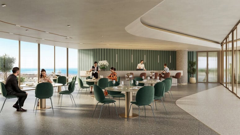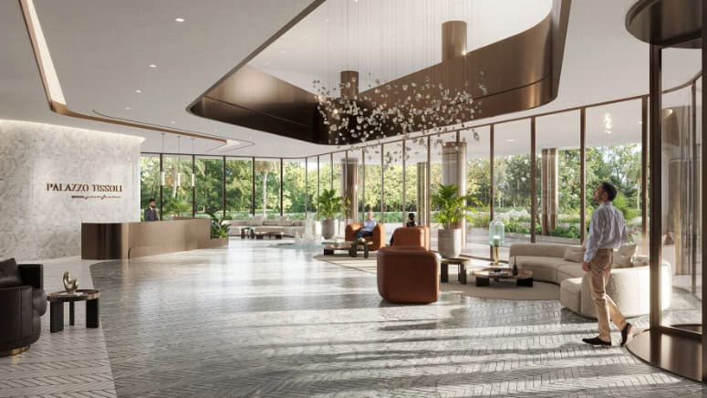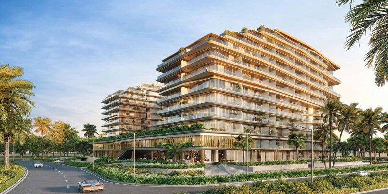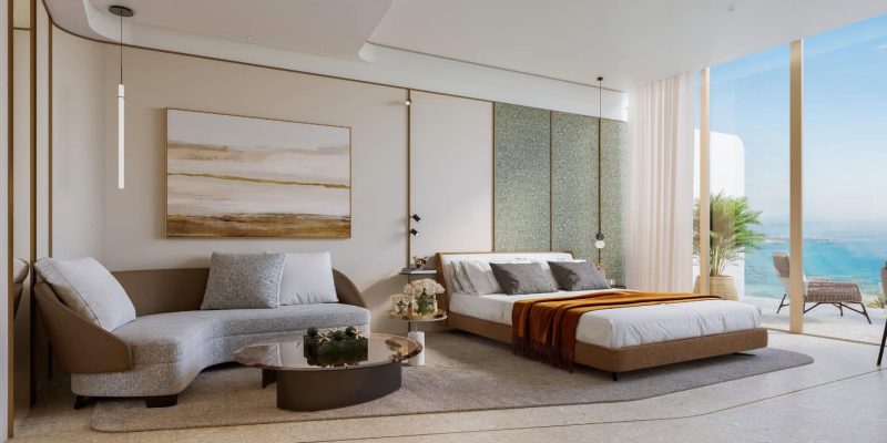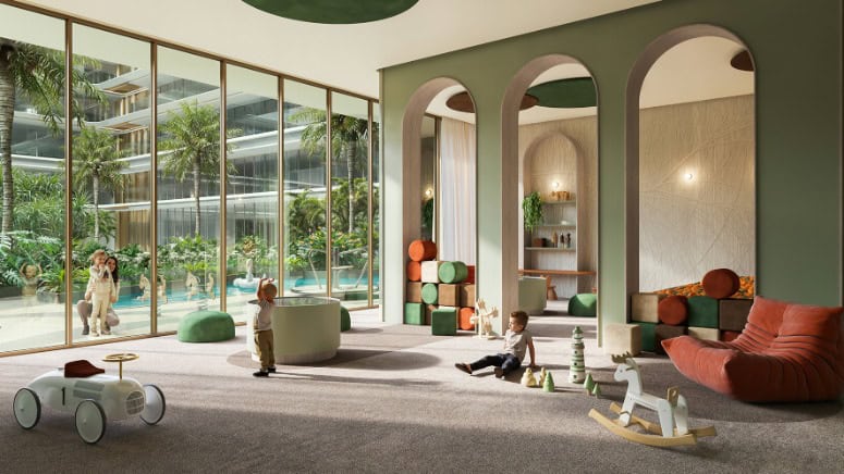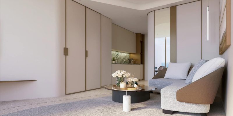 In the interior, the palette is stone, wood, bronze with floor-to-ceiling glazing, walk-in closets and full-fitted kitchens; common areas bring the concept of the Centre of Life into the gardens, lounges, fitness, family and social spaces, a super resort collection of amenities.