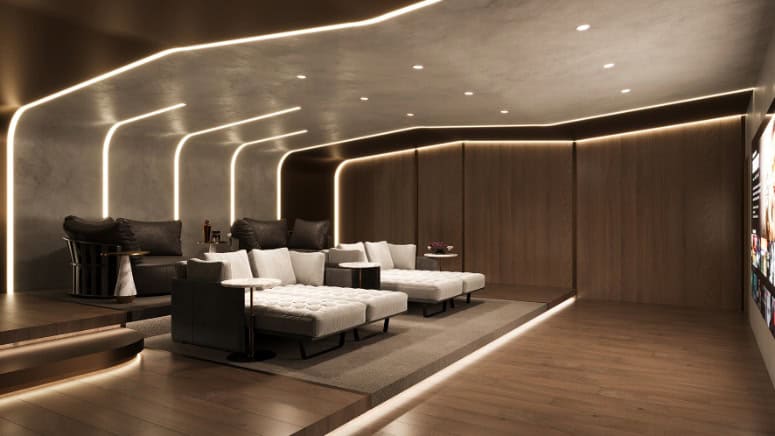 Contoured LED coves and timber panels control light and sound, turning premieres, marathons, or game nights into relaxed rituals a few steps from the lift lobby.