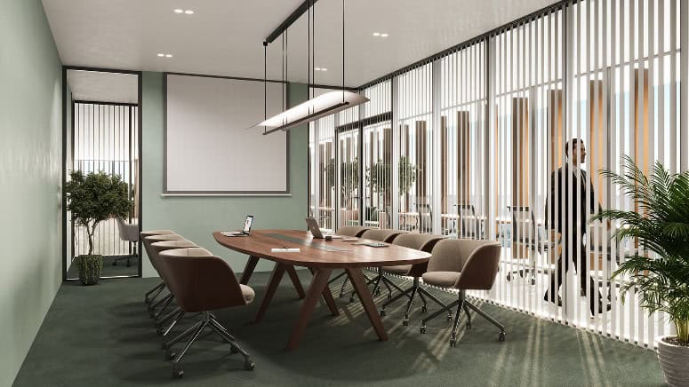 An oval table, integrated display, and ceiling-suspended task lighting keep sessions tidy and professional; daylight through vertical fins balances focus with privacy for remote work or owner presentations.