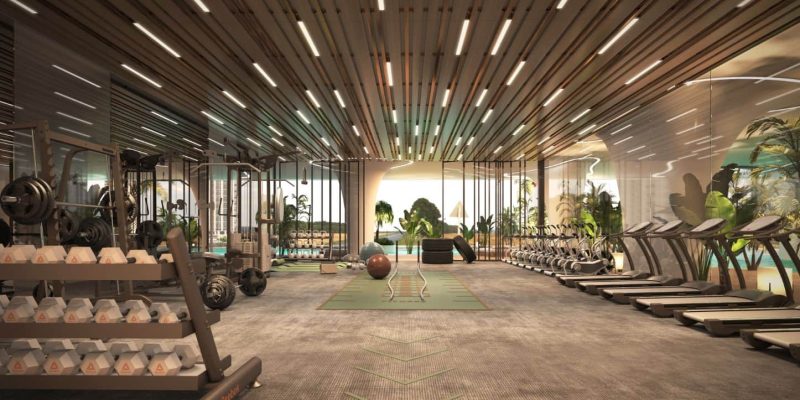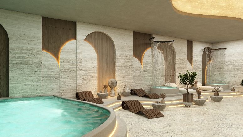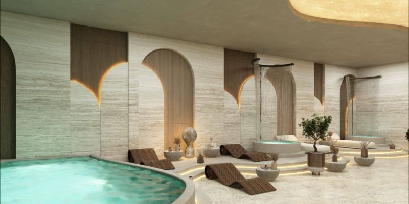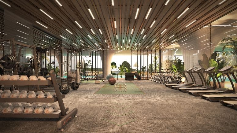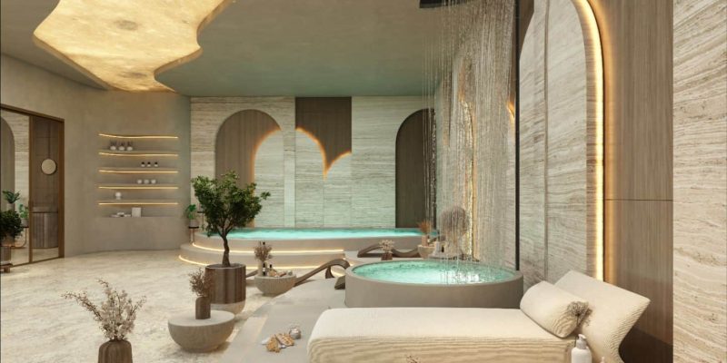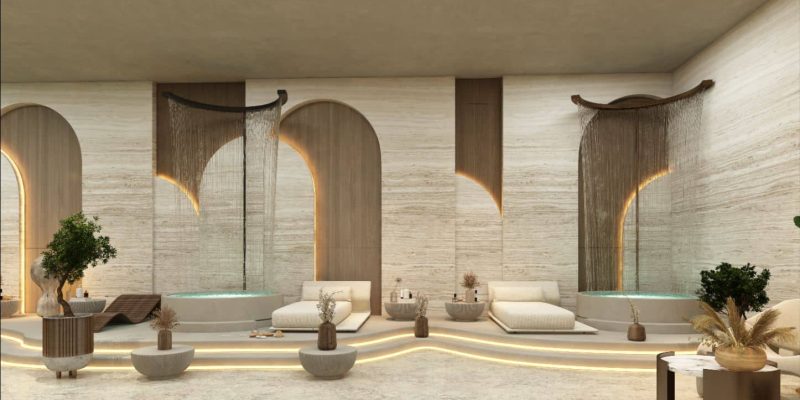 Designed as a hush-quiet sanctuary, the indoor spa pairs warm ambient lighting with natural textures to melt the day away. Private treatment rooms sit beside a dedicated hydrotherapy zone with jacuzzi-style hot tubs, creating a seamless circuit for unwinding after workouts or weekends by the lagoon.