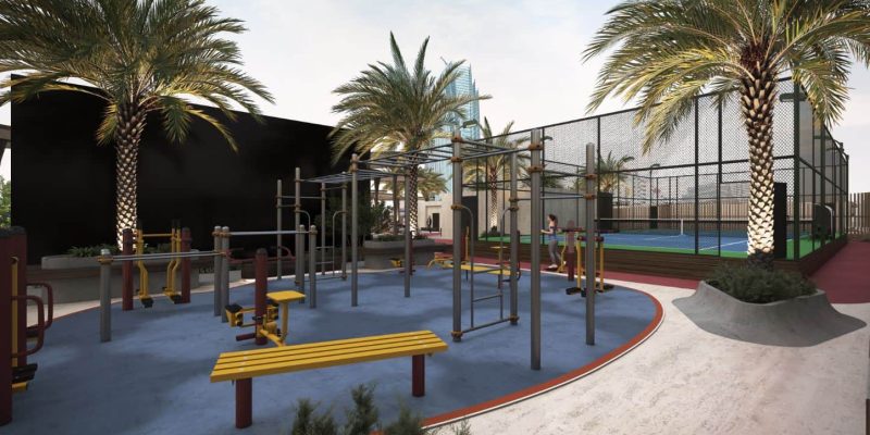 A fully equipped outdoor gym with modern fitness stations, set among palm trees, encourages active living in the open air, complemented by nearby Tennis Courts for racket sports and community recreation.