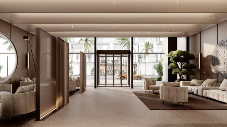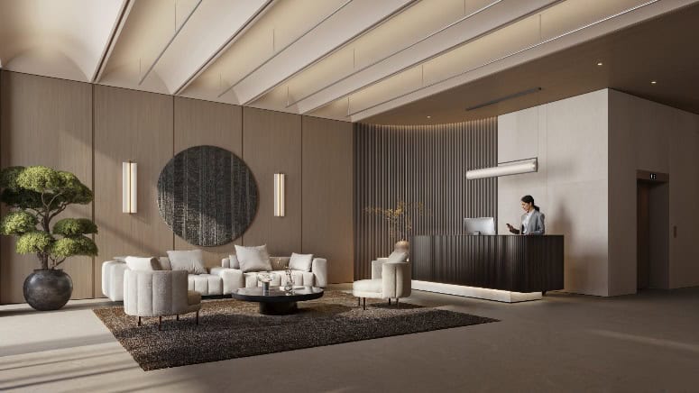 La luz natural atraviesa la fachada de vidrio, creando una conexión clara entre el bulevar bordeado de palmeras y las zonas de descanso acolchadas, divididas por elegantes paneles listonados para privacidad. Paredes texturizadas, alfombras tonales y vegetación seleccionada suavizan la geometría, mientras que la circulación generosa ofrece una llegada sin prisa —una introducción acogedora antes de los ascensores y las residencias.