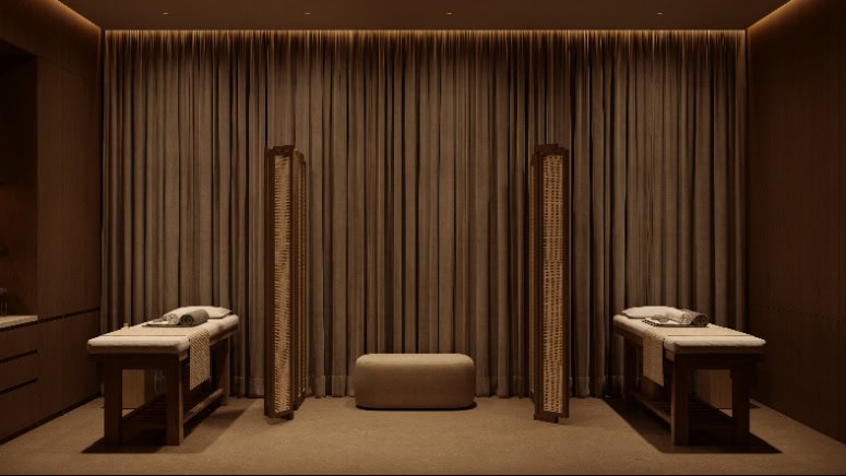 Dos camillas de masaje, biombos tejidos y una paleta cálida monocromática invitan a una exhalación profunda; la secuencia de bienvenida–tratamiento–té está diseñada para ser lenta y sin prisas. Cada superficie —madera, tejido, piedra suave— se siente serena y equilibrada.