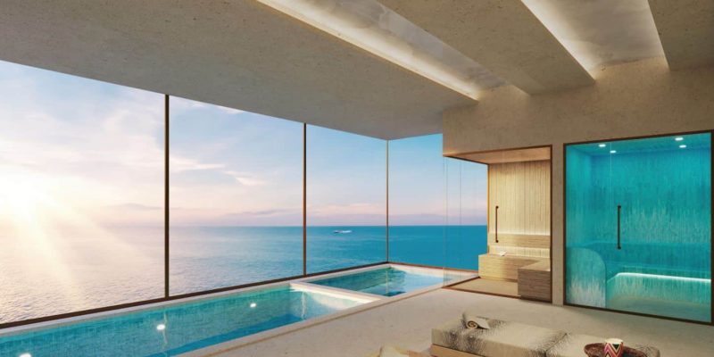La piscina de agua salada es una playa artificial con vistas panorámicas al mar e incluye varias zonas de relax de lujo y espacios verdes.