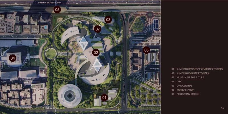 Emirates Tower Residences este situat într-o zonă prestigioasă din centrul orașului Dubai - DIFC, cu acces facil la faimoasa șosea Sheikh Zayed, care reprezintă o legătură excelentă de transport către Emirates învecinată și, de asemenea, o rută excelentă care traversează inima Dubaiului, oferind acces facil la destinații turistice și facilități emblematice. Burj al Khalifa, Dubai Mall, Mall of the Emirates, City Walk, Burj al Arab, Mall of the Emirates, Jumeirah Beach și Aeroportul Internațional Dubai se află la doar 15 minute de reședință, ceea ce face ca aceasta să fie o oportunitate excelentă pentru investitori.